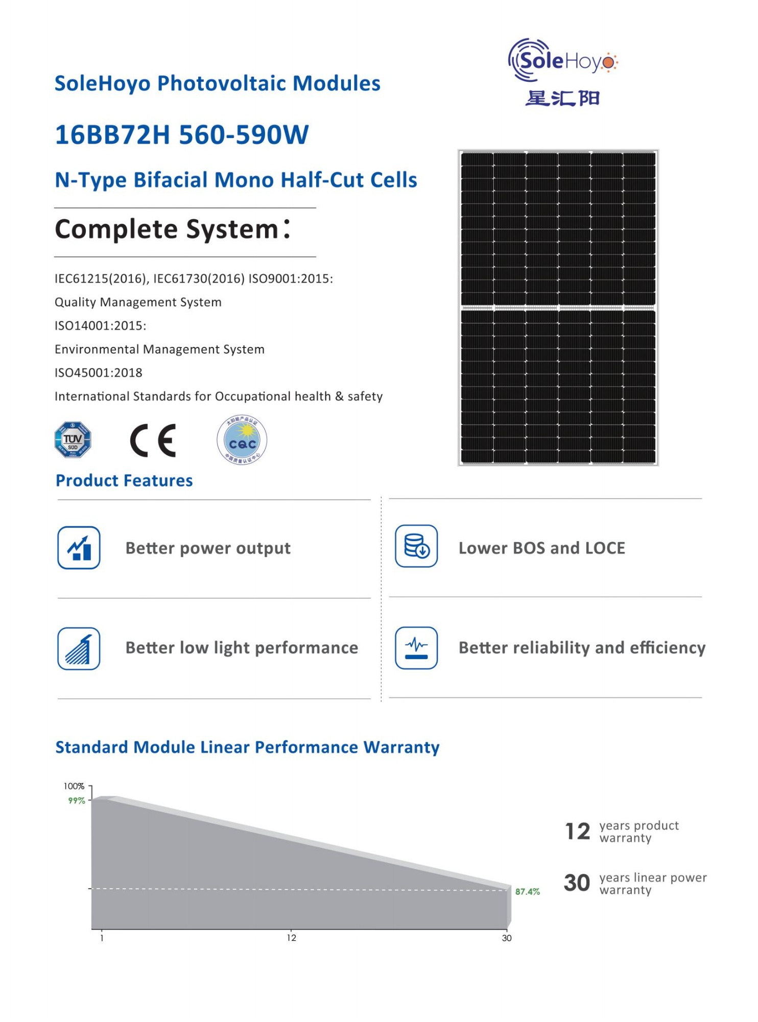 Rugged Reliability: Certified to IEC 62941, ISO 9001, ISO 14001, and ISO 45001 standards. It features excellent resistance to PID, micro-cracks, and hot spots. With a mechanical load capacity of 5400Pa (front) and 2400Pa (rear), it performs reliably in harsh environments, including high humidity and dusty conditions.