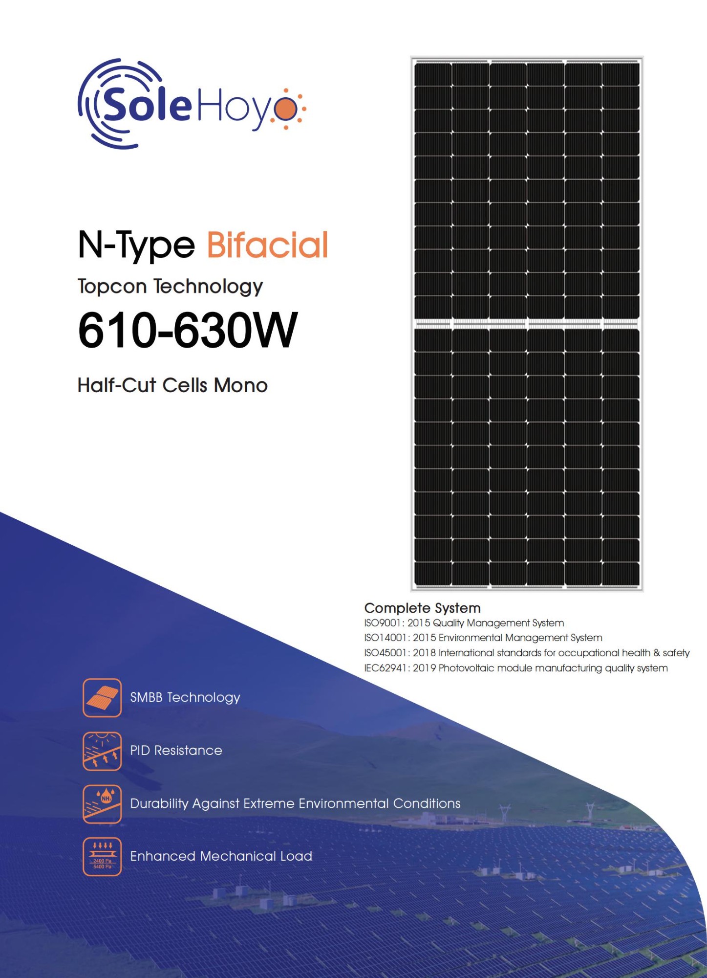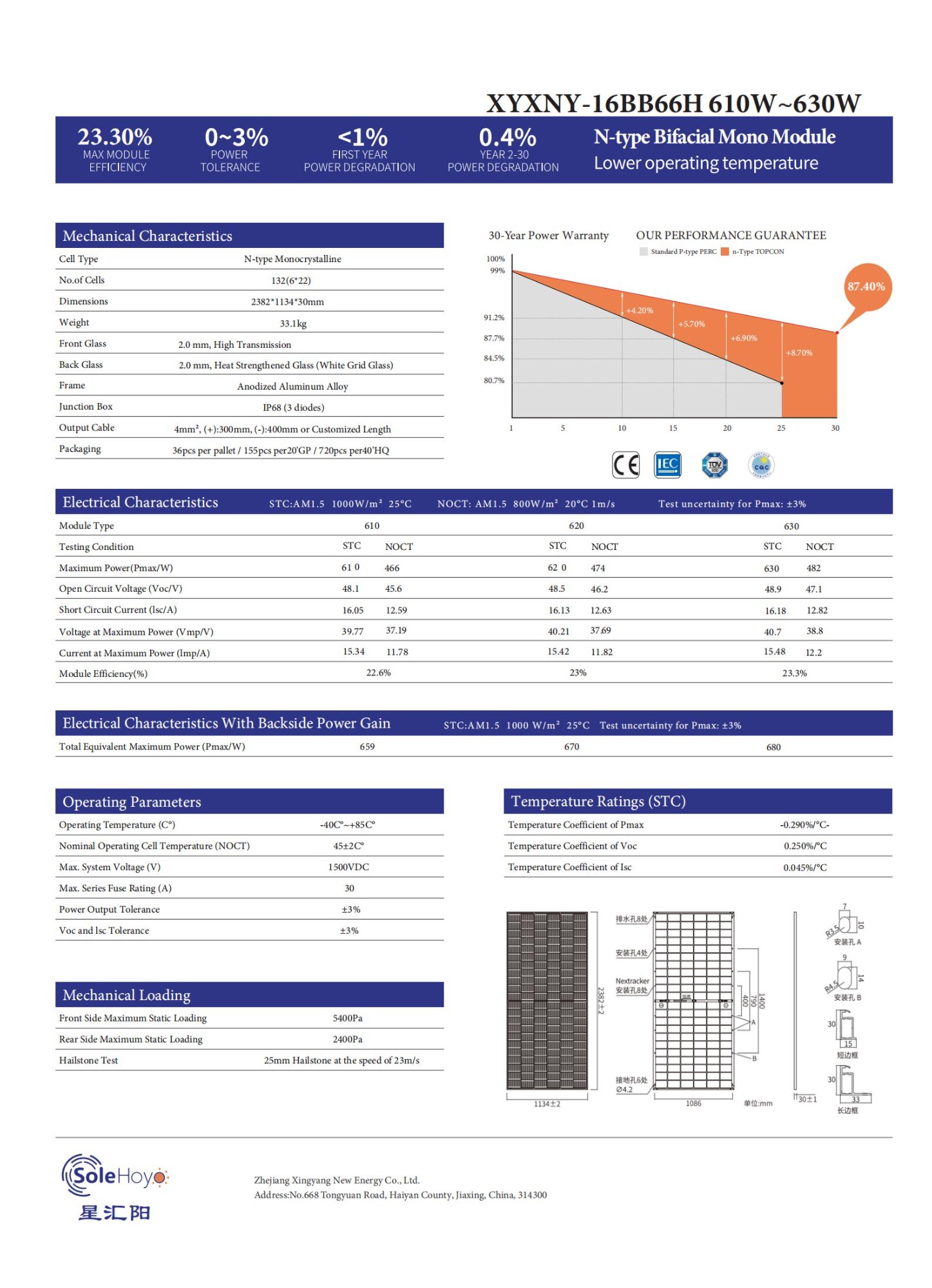 The SoleHoyo XYXNY-16BB66H series is a high-power, high-efficiency solar module engineered for the global utility-scale and large commercial & industrial (C&I) solar energy market. Boasting top-tier N-type TOPCon bifacial technology, ultra-low power degradation and superior environmental durability, it is the ideal solution for large-scale ground-mounted solar power plants and industrial photovoltaic projects, delivering high-yield and cost-effective clean energy across global markets.