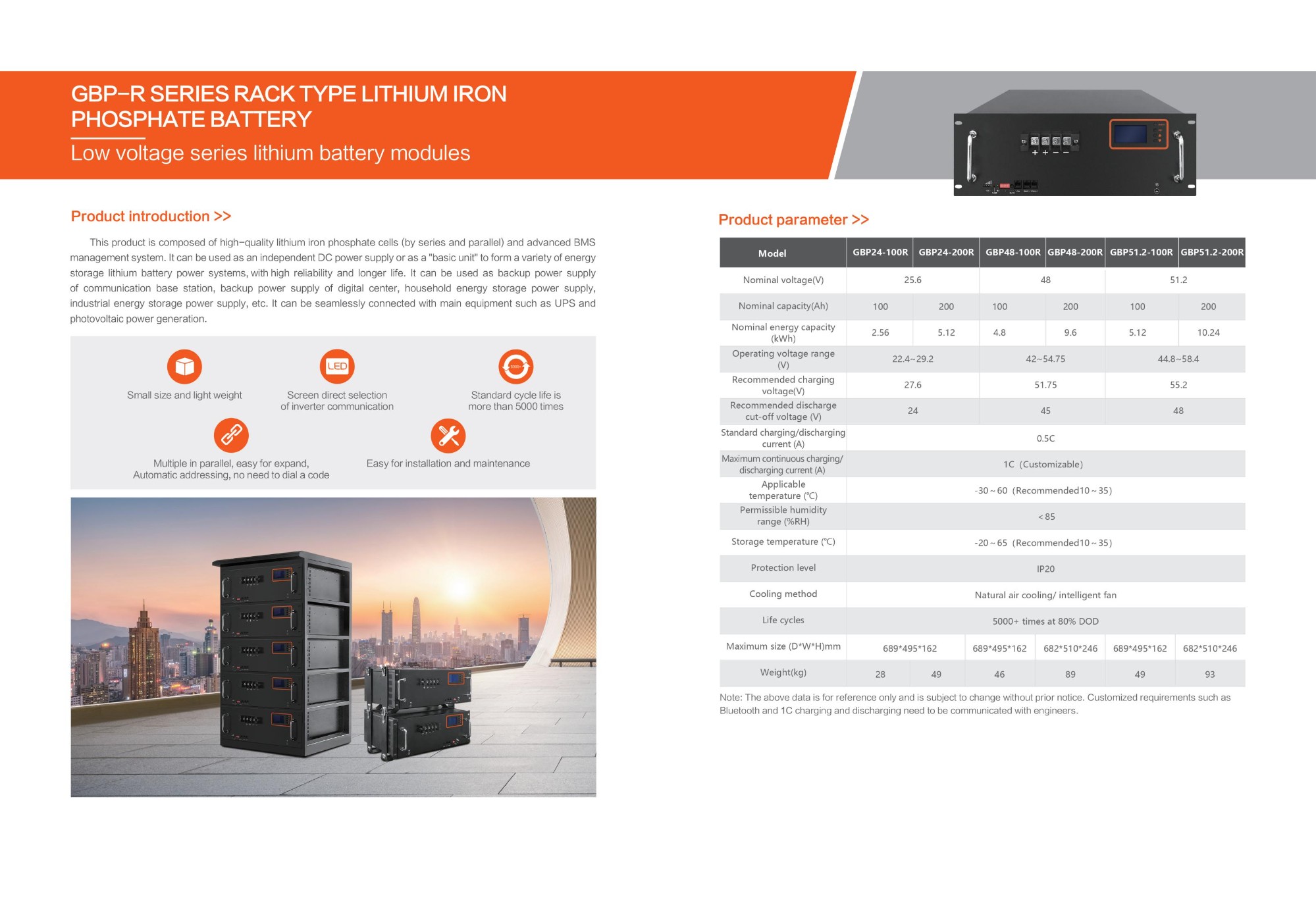 Superior Reliability & Longevity: Built with high-quality LiFePO4 cells and an advanced Battery Management System (BMS), it ensures stable performance and a cycle life of over 5,000 times at 80% DOD. The small size and light weight simplify installation and maintenance, while the screen direct selection of inverter communication protocols enables seamless integration with UPS, photovoltaic systems, and other main equipment.